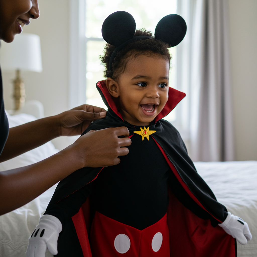To achieve this look, start with traditional Mickey Mouse pieces from Disney Store or Party City ($25-45 for kids, $35-60 for adults). Add a vampire cape from Spirit Halloween ($15-20), white face paint for pale skin, and plastic vampire fangs ($3-5). The key is balancing Mickey’s playful nature with vampire elegance – think sophisticated Dracula rather than scary monster.