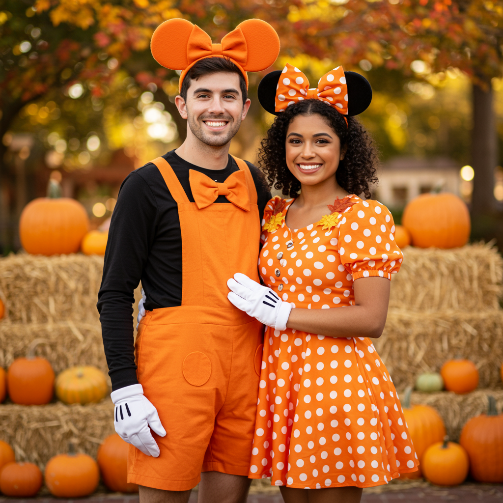 Create an adorable couples or sibling costume by dressing as Mickey and Minnie in their autumn best. Mickey wears his classic outfit with pumpkin-colored accents, while Minnie sports an orange polka-dot dress with fall leaves in her bow. This theme celebrates both Halloween and harvest season, making it perfect for family photos and fall festivals.