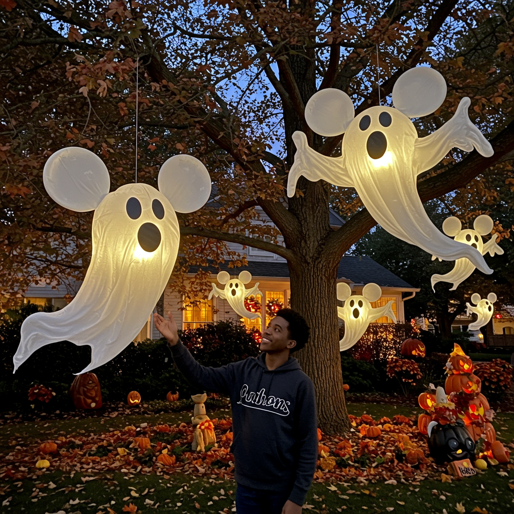 Turn your yard into a Disney haunted mansion with oversized Mickey Mouse ghost decorations. These floating Mickeys combine the classic three-circle silhouette with translucent white fabric that moves beautifully in autumn breezes. The familiar shape immediately signals Disney magic while the ghostly treatment adds perfect Halloween ambiance.