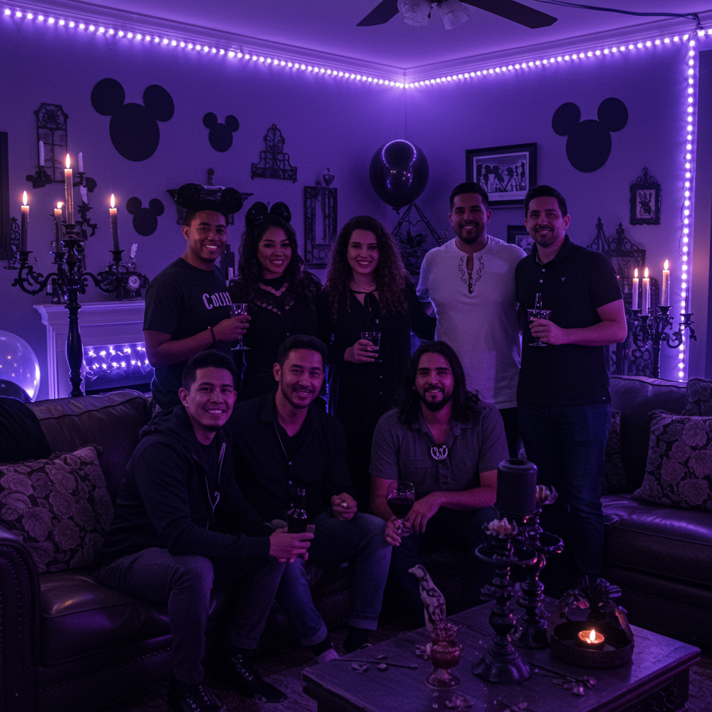 Use battery-operated purple LED lights from Amazon ($12-20) to create the ride’s signature glow. Print Mickey head silhouettes on cardstock and cut them out to create shadows on walls using flashlights. Dollar Tree has perfect gothic decorations like plastic candelabras ($1-3 each) that you can customize with Mickey elements using black vinyl stickers from Cricut ($8-15).