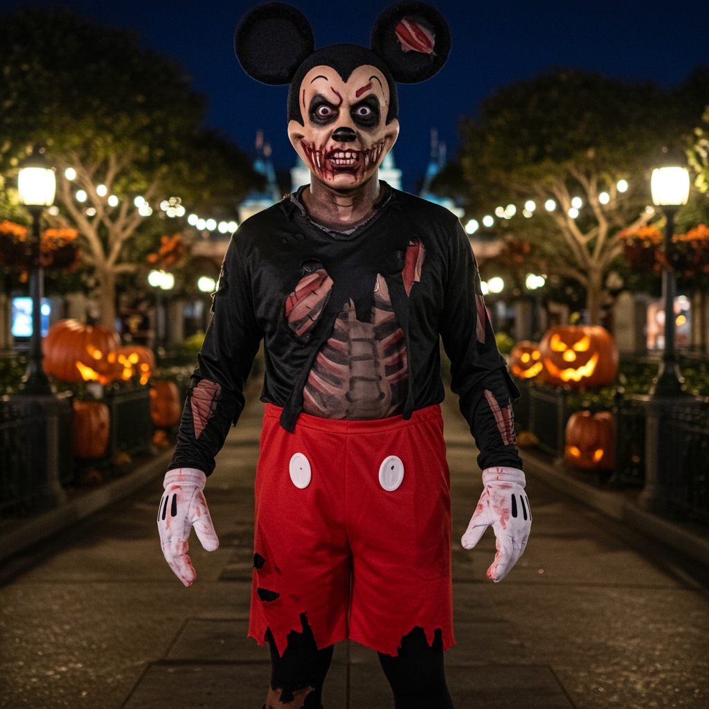 Zombie Mickey, Vintage Mickey horror posters, or Mickey witch mashup costumes appeal to teens who want Disney elements without looking too childish. These themes maintain Mickey recognition while adding sophisticated Halloween elements that photograph well for social media and feel age-appropriate for high school Halloween events.