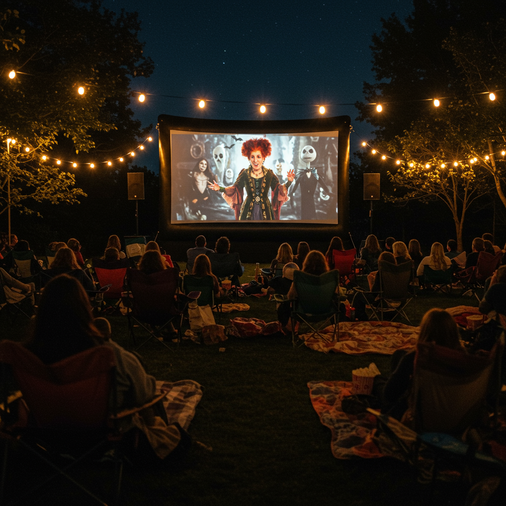 Rent or buy an outdoor projector and screen setup. Classic horror films like Hocus Pocus or Nightmare Before Christmas work great for mixed age groups.