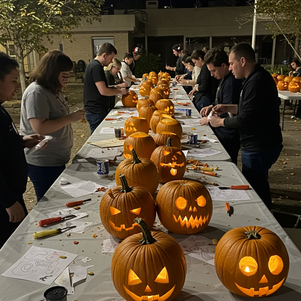 Set up tables with carving tools, templates, and cleaning supplies. Provide various pumpkin sizes and difficulty levels for different skill levels.