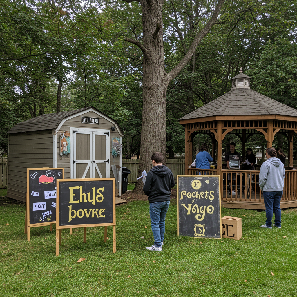 Create connected puzzle challenges that require teams to move between different outdoor areas. Use existing structures like sheds, gazebos, or natural features.