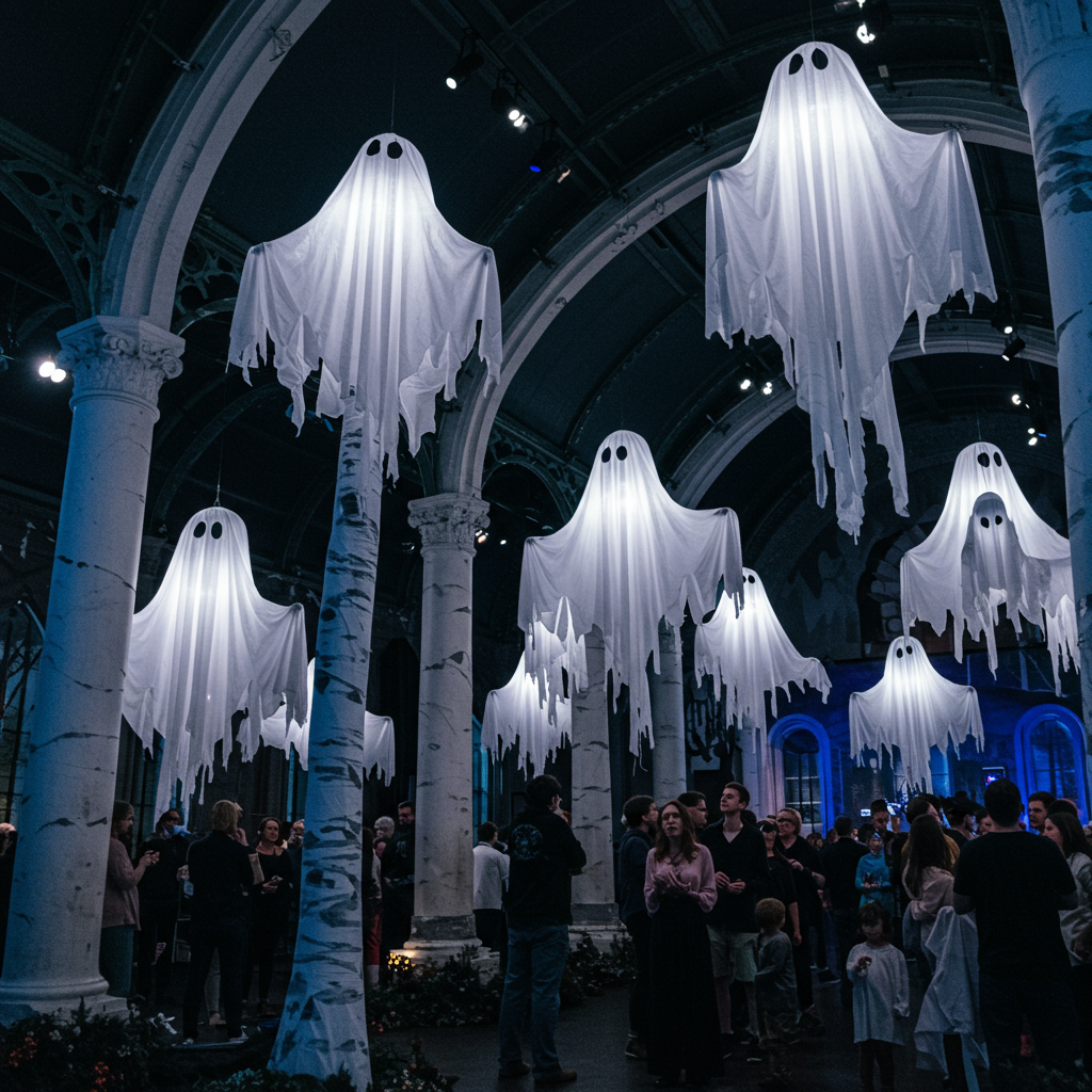 Create ghosts using white fabric, styrofoam balls, and fishing line. Vary sizes and positions for natural floating effects.