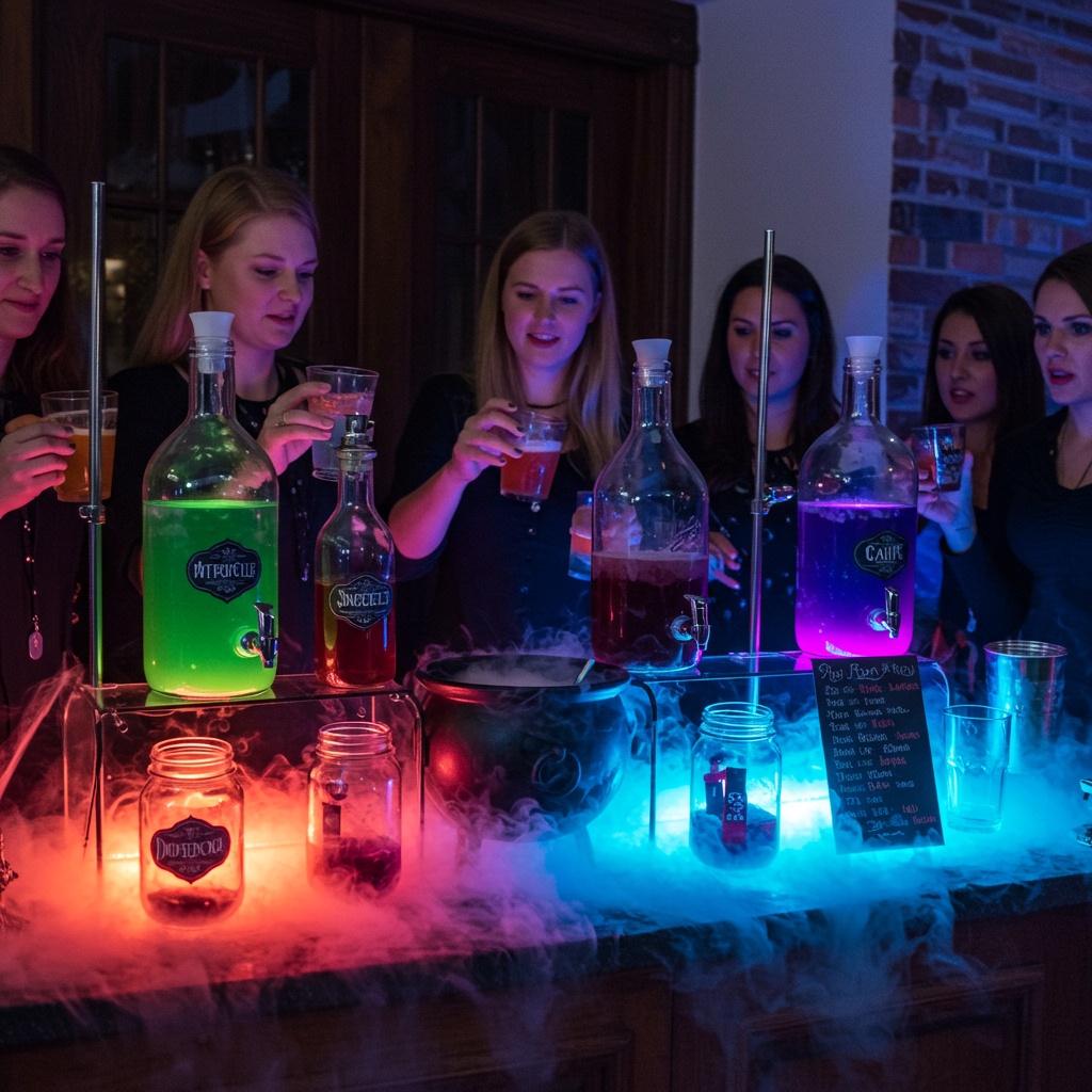 Transform your drink area with glass bottles, dry ice effects, and spooky labels. Use mason jars, laboratory glassware, and colored liquids for authentic potion vibes.