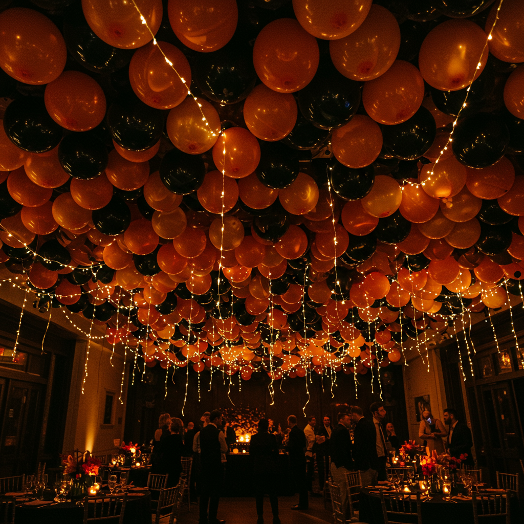 Fill balloons with helium and let them naturally cluster at ceiling height. Mix matte black, glossy orange, and metallic copper balloons for visual depth.