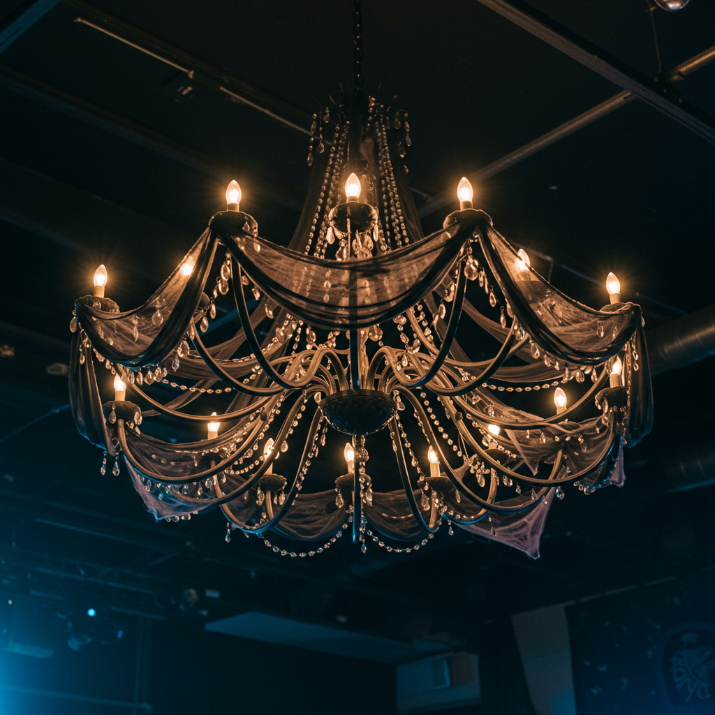Wrap existing chandeliers or hanging lights with black fabric, fake spider webs, and battery-powered LED candles.