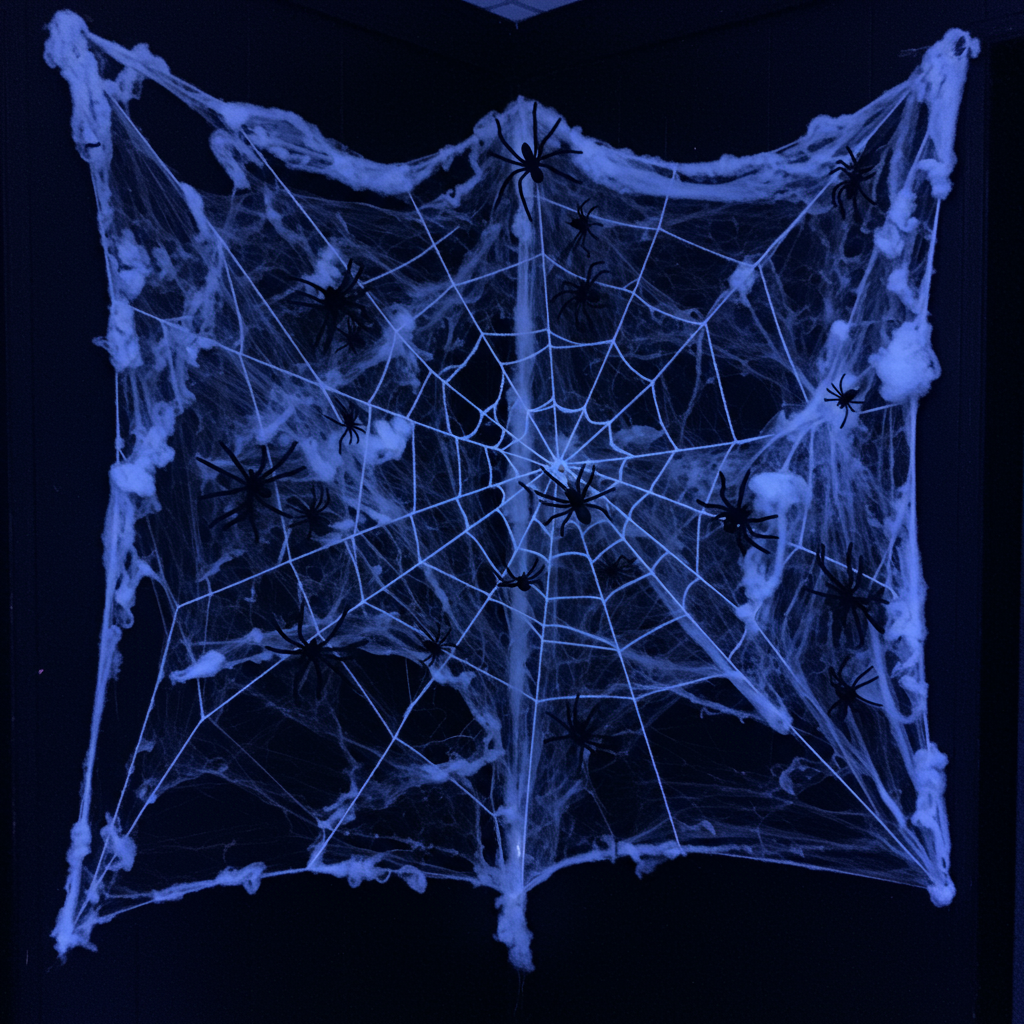 Use white cotton batting stretched between walls to create realistic web structures. Add various sized plastic spiders and maybe some fake trapped flies.