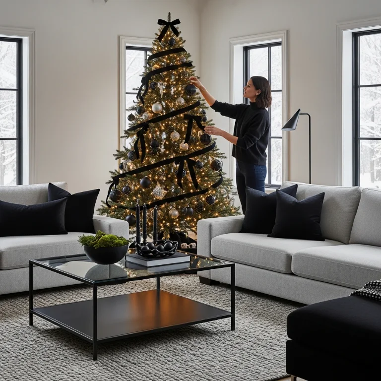 Add black ornaments or ribbon to traditional decorations. The dark accents create sophisticated designer contrast. Your black Christmas modernizes beautifully!