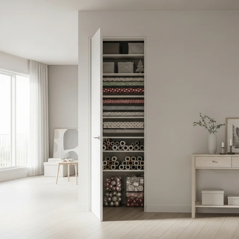 Concealing holiday items preserves clean appearance daily. This practical approach prevents messy scattered look. The storage hides!