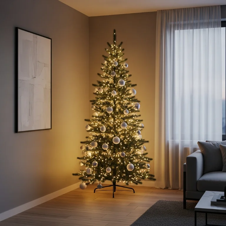 Choose slim pencil tree fitting corner without overwhelming space. The singular focal point creates festive feeling without chaos. Your tree apartment celebrates beautifully!