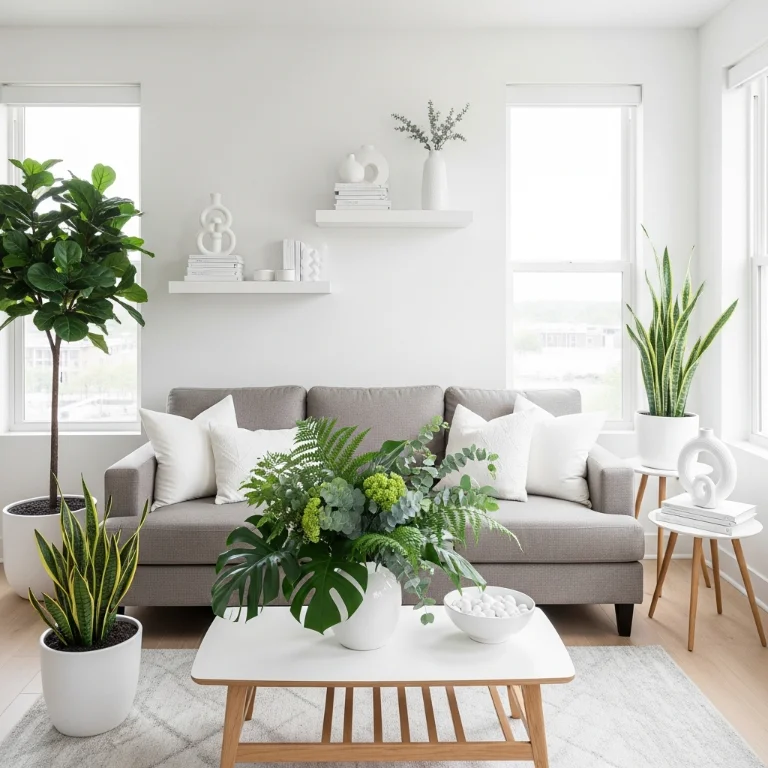 Use only white ornaments and natural greenery throughout apartment. The fresh combination feels modern and peaceful. Your white apartment glows gorgeously!