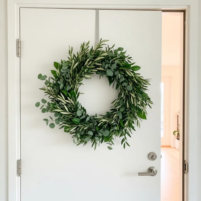 Hang minimalist wreath made from fresh greenery only. The unadorned circle creates elegant welcome without busy details. Your wreath apartment greets gorgeously!