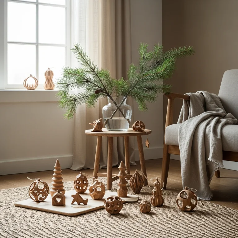 Use wooden ornaments and real greenery avoiding plastic. The authentic materials create genuine holiday feeling. Your natural apartment celebrates beautifully!
