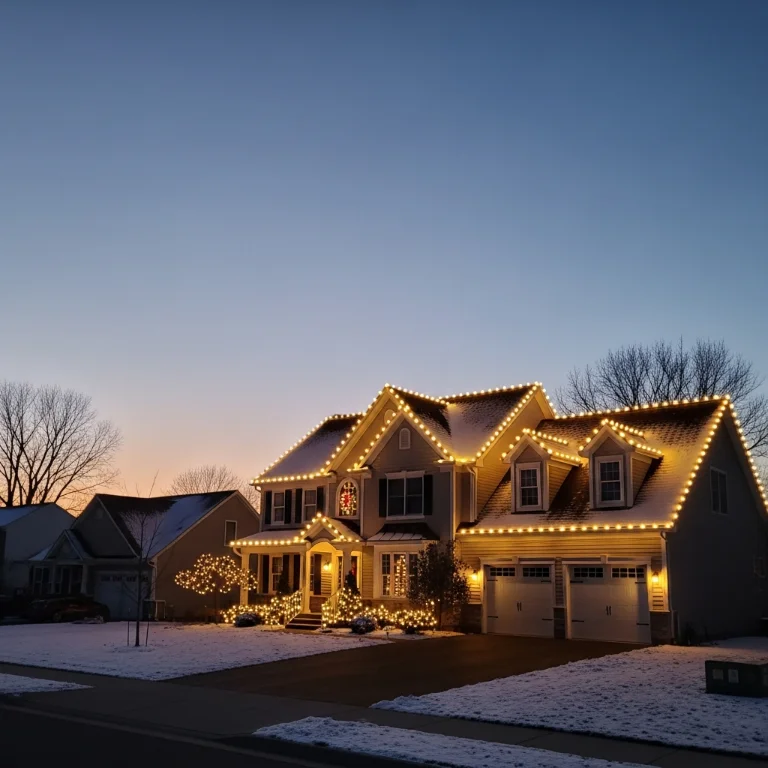 String warm white lights along entire roofline and gutters. The glowing outline creates elegant traditional Christmas display. Your white outdoor lights classic gorgeously!