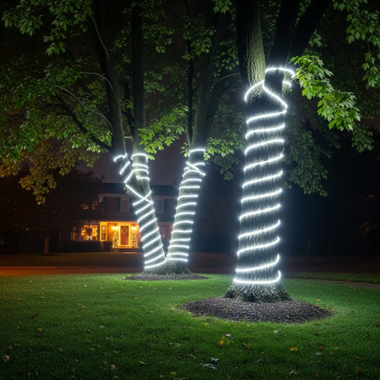 Wrap tree trunks with white lights spiraling from bottom up. The illuminated trees create stunning nighttime focal points. Your wrapped outdoor lights enchant beautifully!