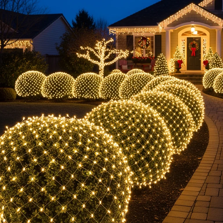 Drape net lights over bushes creating glowing hedge instantly. The quick installation covers large areas efficiently. Your net outdoor lights install gorgeously!