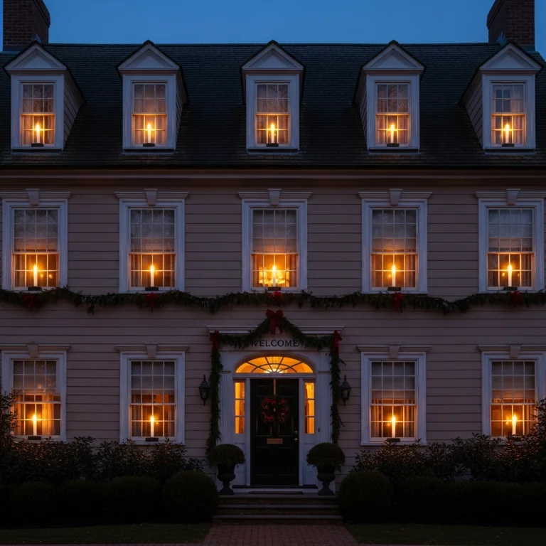 Electric candles in windows create classic colonial look. This timeless display feels genuinely traditional warm. The candles flicker!