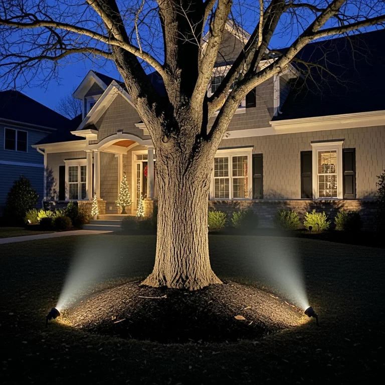 Uplights illuminate trees and architectural elements dramatically. This professional technique adds depth and dimension. The stakes spotlight!