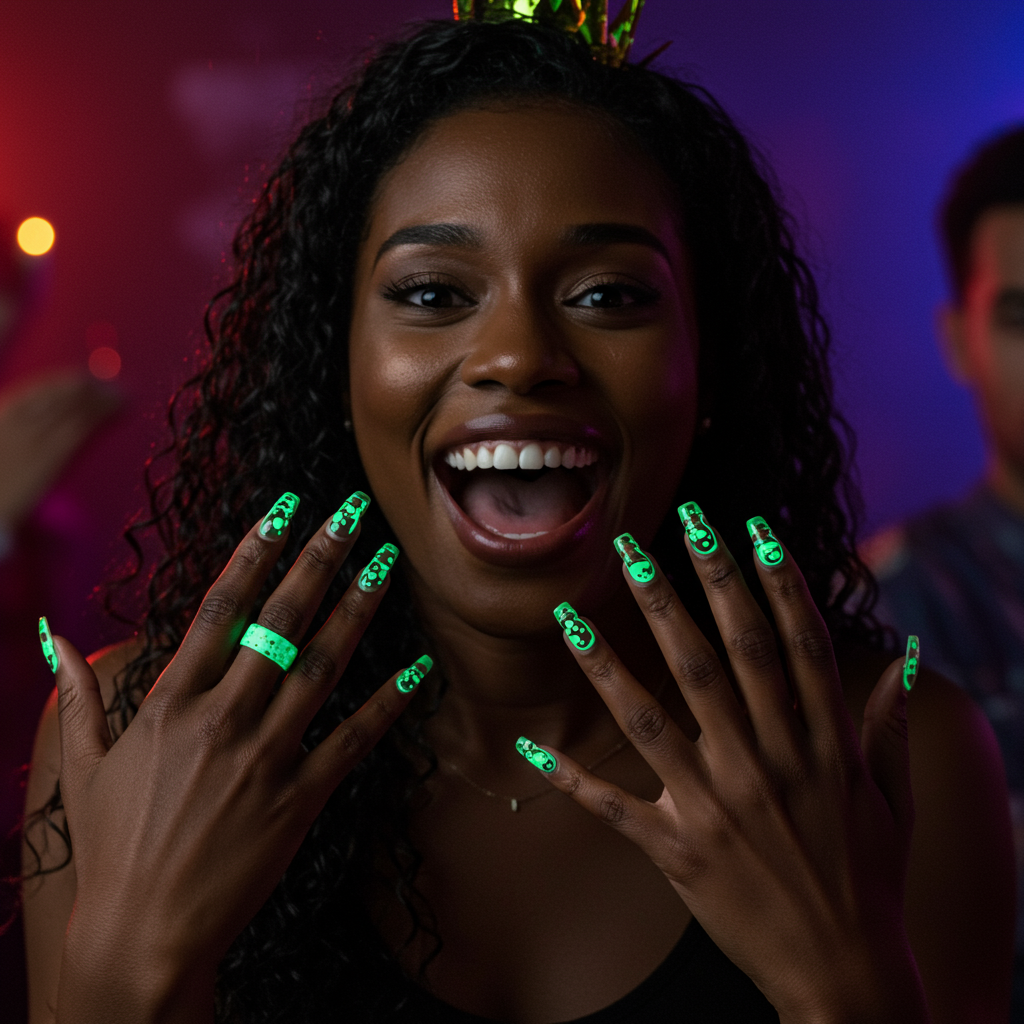 These nails are perfect for anyone hosting Halloween parties or hitting up haunted attractions where the lighting effects will really shine. The glow effect lasts about 30 minutes after light exposure, so they’ll keep surprising people all night long. You can customize the potion colors – try pink, green, or blue glow polishes for different magical effects.