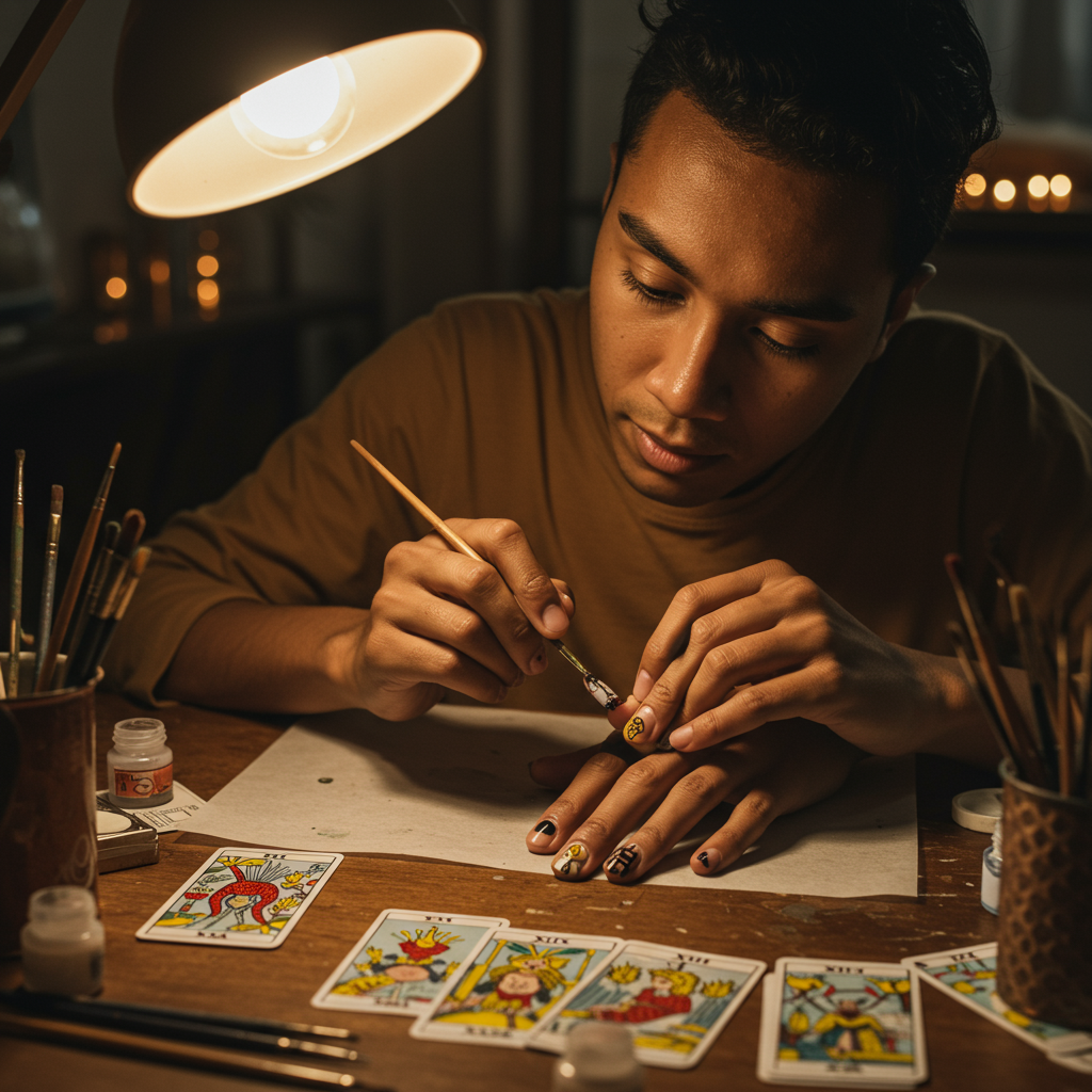 Channel mystical energy with nails featuring miniature hand-painted tarot card designs. Each nail showcases a different card with intricate details that look like tiny works of art.