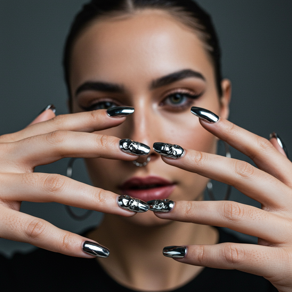 Ultra-modern chrome skulls that look like liquid metal poured over your nails. This design combines the edginess of skull imagery with the luxury feel of chrome finishes that are huge in 2025.