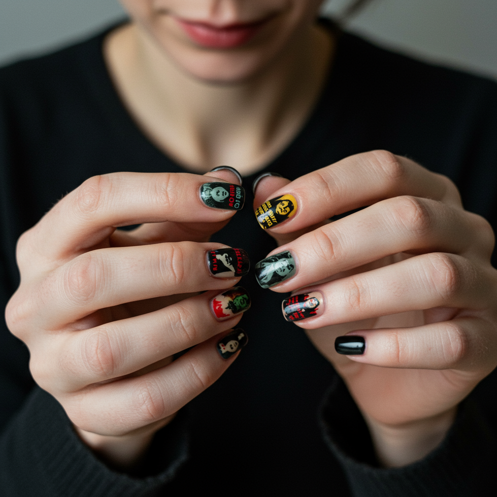 Transform your nails into miniature vintage horror movie posters complete with retro fonts, dramatic imagery, and aged color palettes. Each nail becomes a tiny piece of cinema history.