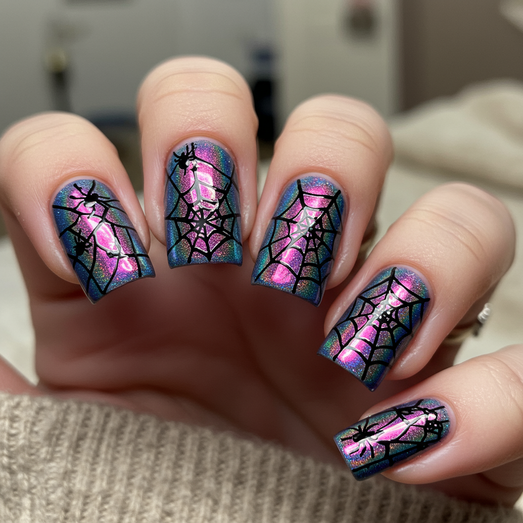 Transform your nails into mesmerizing holographic masterpieces that shimmer with every movement while featuring intricate spider web details. This design combines the trending holographic finish with classic Halloween imagery for a modern spooky twist.