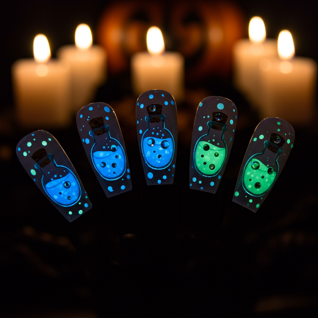 These nails feature tiny potion bottles that actually glow in the dark, complete with bubbling effects and mysterious contents. The 3D elements combined with phosphorescent polish create nails that transform completely in low light.