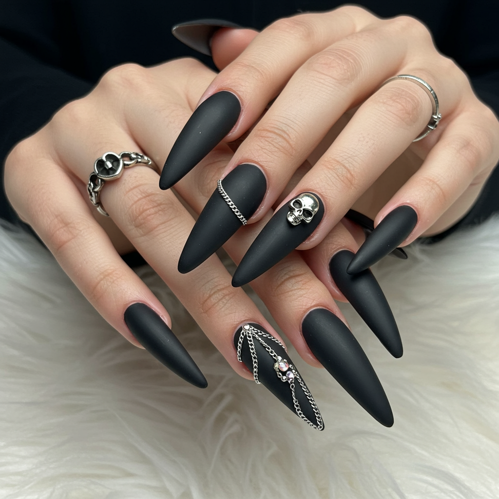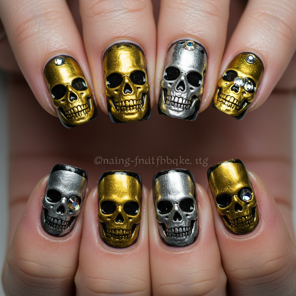 Use nail stamping plates or freehand painting to create detailed skull patterns. Metallic polish gives luxury gothic vibes.