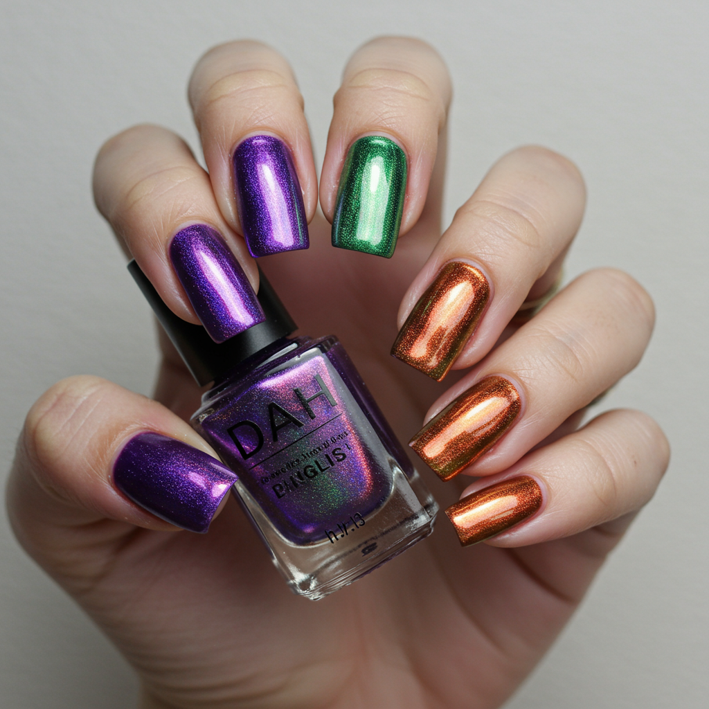 Mirror-finish chrome powder in purple, green, or orange hues.