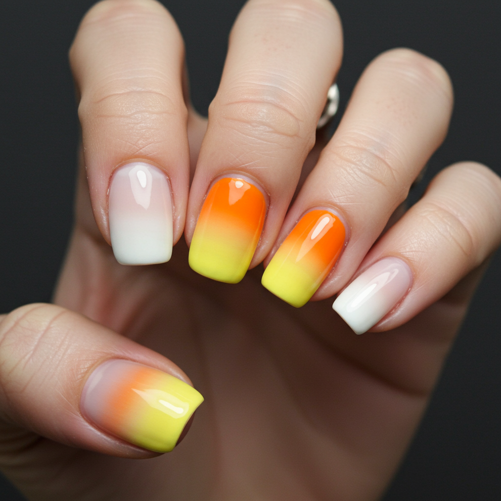 Traditional candy corn colors in smooth gradient transitions. Layer white at cuticle, orange in middle, and yellow at tips. Blend colors seamlessly for authentic candy corn appearance.