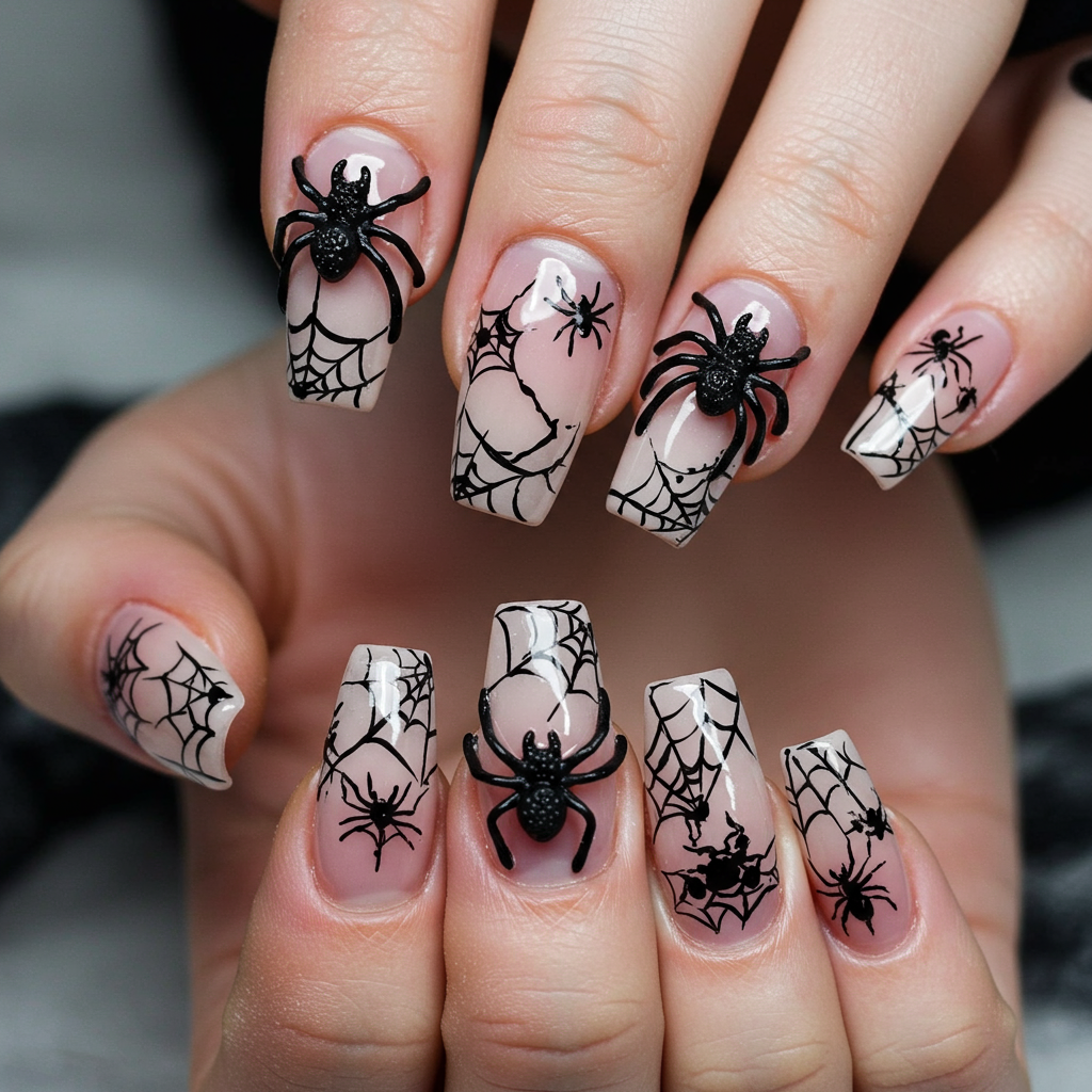 Realistic 3D spider sculptures on accent nails with web backgrounds.