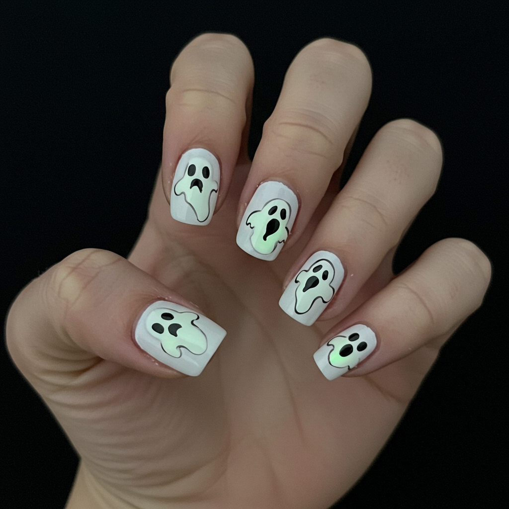 Paint simple ghost silhouettes using glow-in-the-dark polish over black base. Add black dots for eyes and mouths.