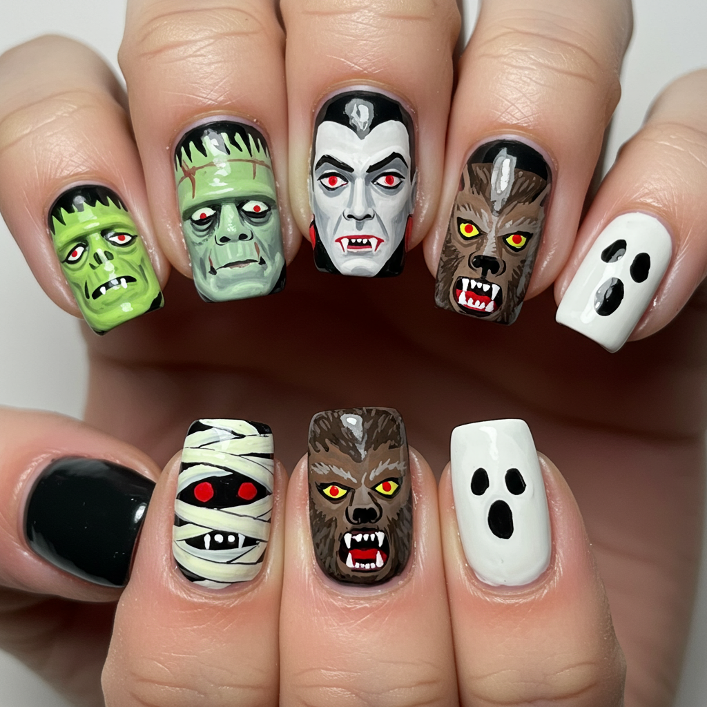 Paint Frankenstein, Dracula, werewolf, mummy, and ghost faces across your fingernails. Use nail art brushes for detailed facial features.