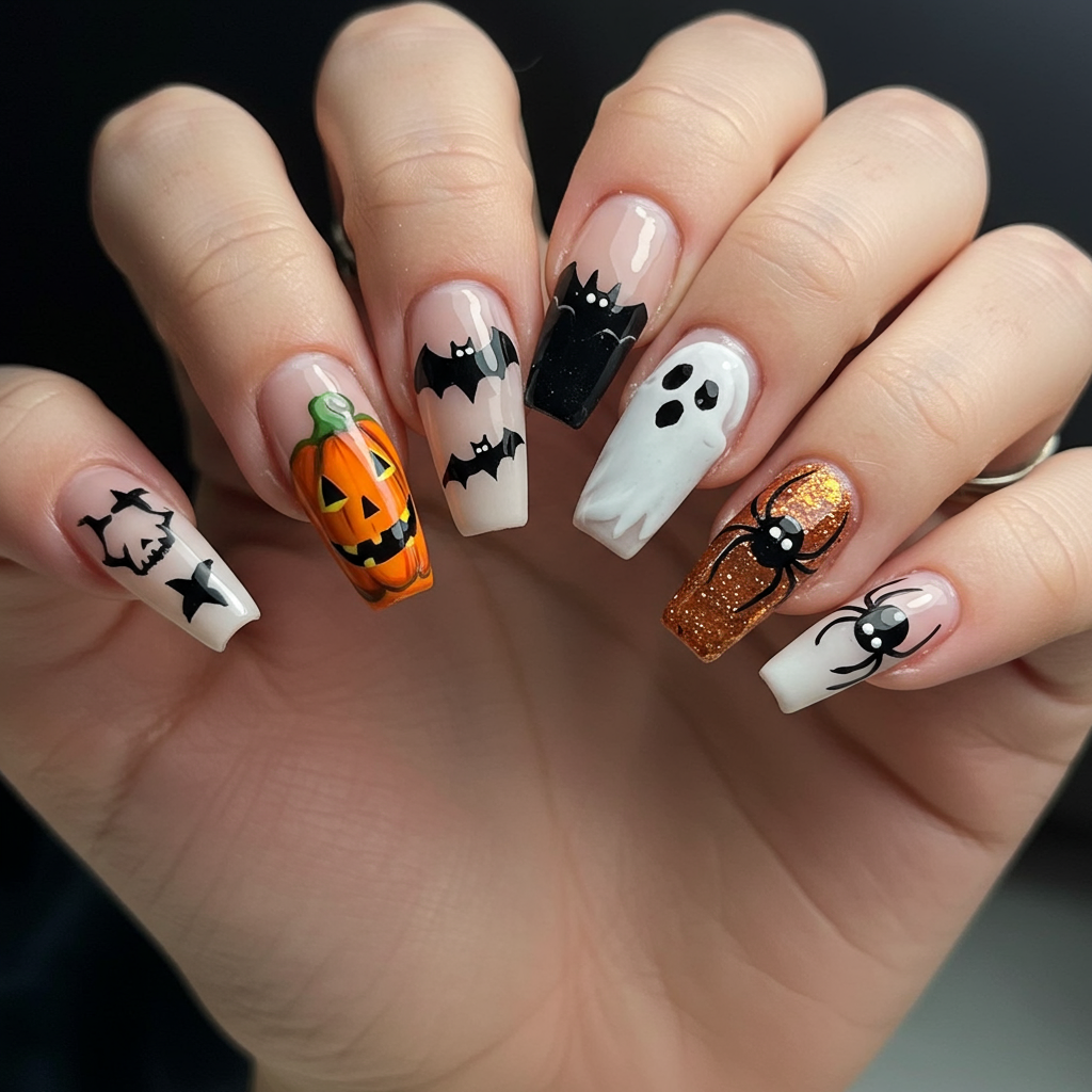Different Halloween designs on coffin-shaped nails. Shape nails into coffin/ballerina style then create different Halloween designs on each nail. Mix pumpkins, bats, ghosts, and spiders.