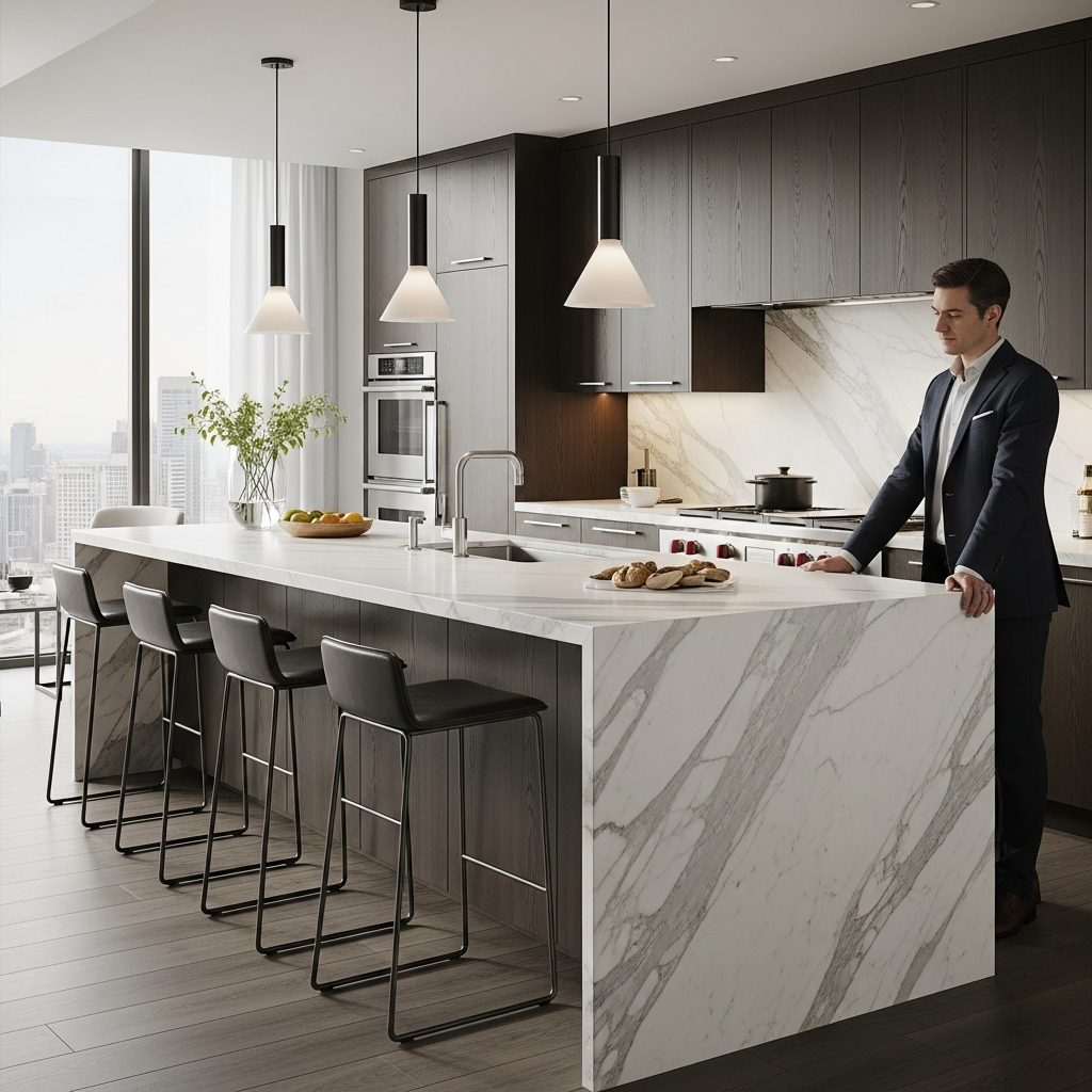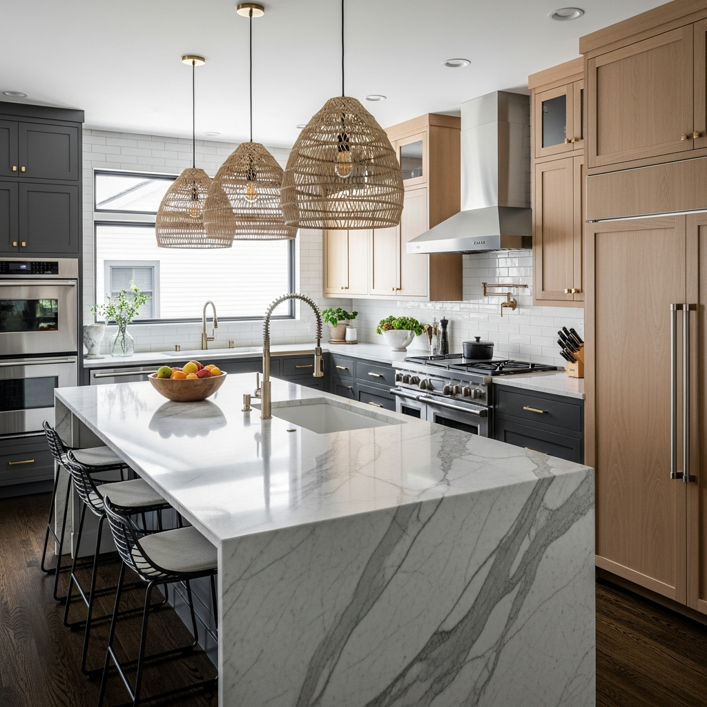 Extend quartz or marble down island ends creating dramatic effect. The flowing stone adds serious visual impact. Your waterfall kitchen impresses gorgeously!