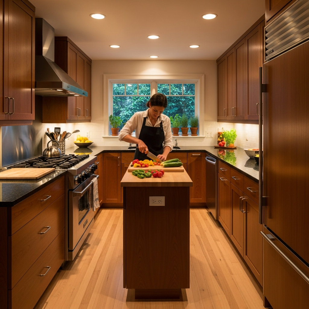 Narrow kitchen gains workspace with central island addition. This layout transforms tight spaces completely. The galley expands!