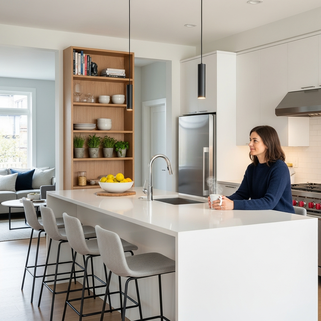 Island defines kitchen zone while maintaining visual connection. This modern approach creates contemporary feel. The open flows!