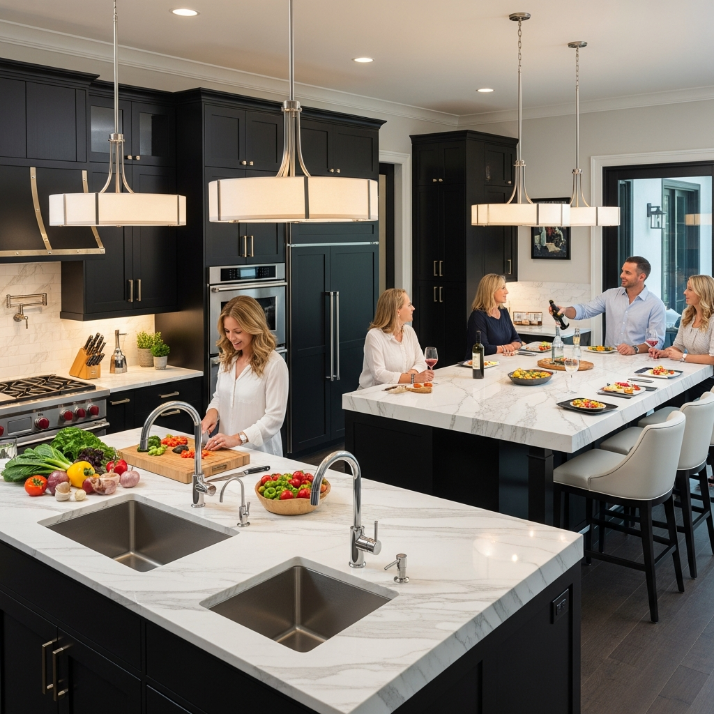 Install main cooking island and secondary serving island nearby. The multiple workspaces allow different activities simultaneously. Your double kitchen multiplies gorgeously!