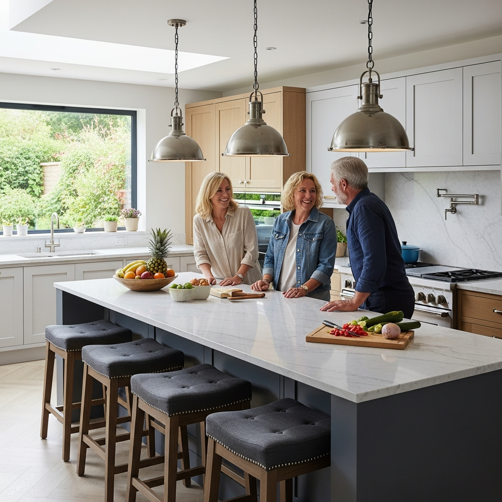 Add twelve-inch overhang on one island side for seating. The extended edge creates casual dining without extra furniture. Your dining kitchen eats perfectly!