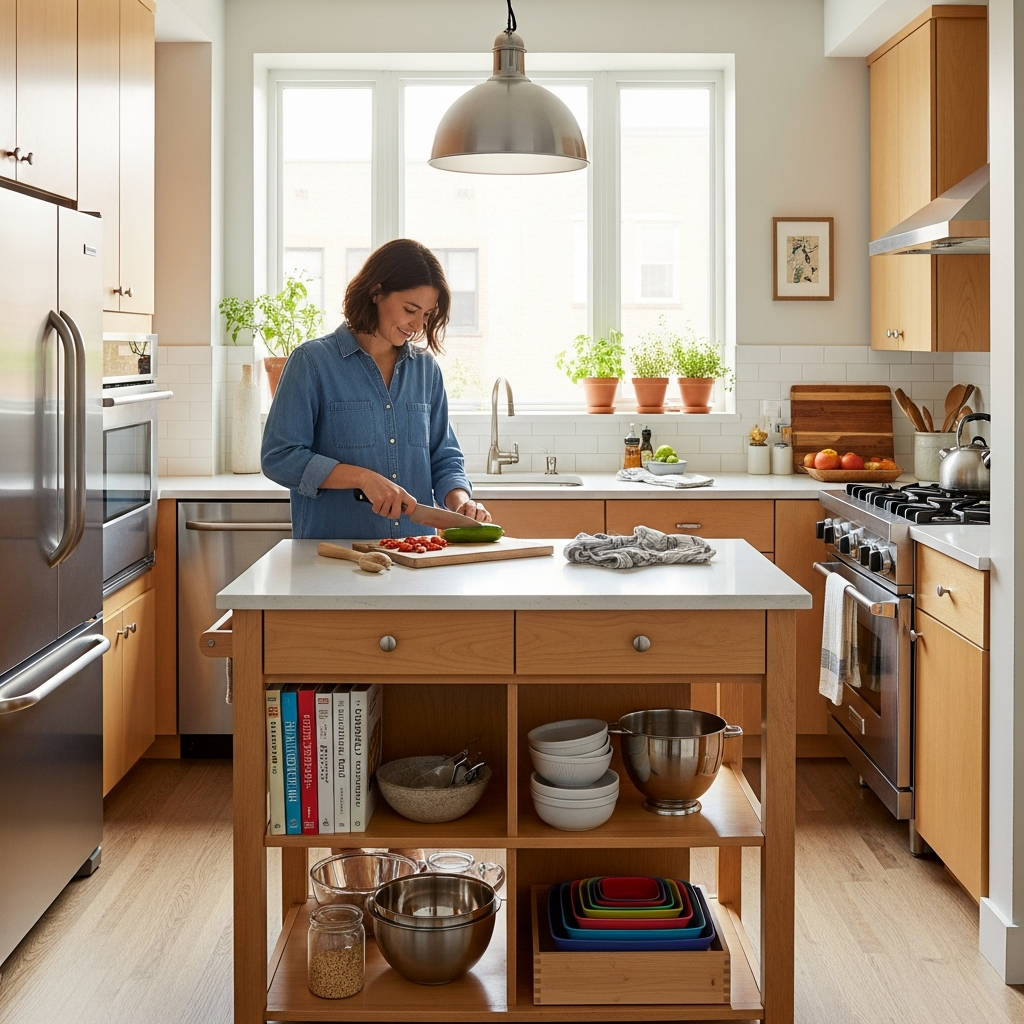 Mobile cart-style island moves when not needed. Your flexible kitchen adapts perfectly!