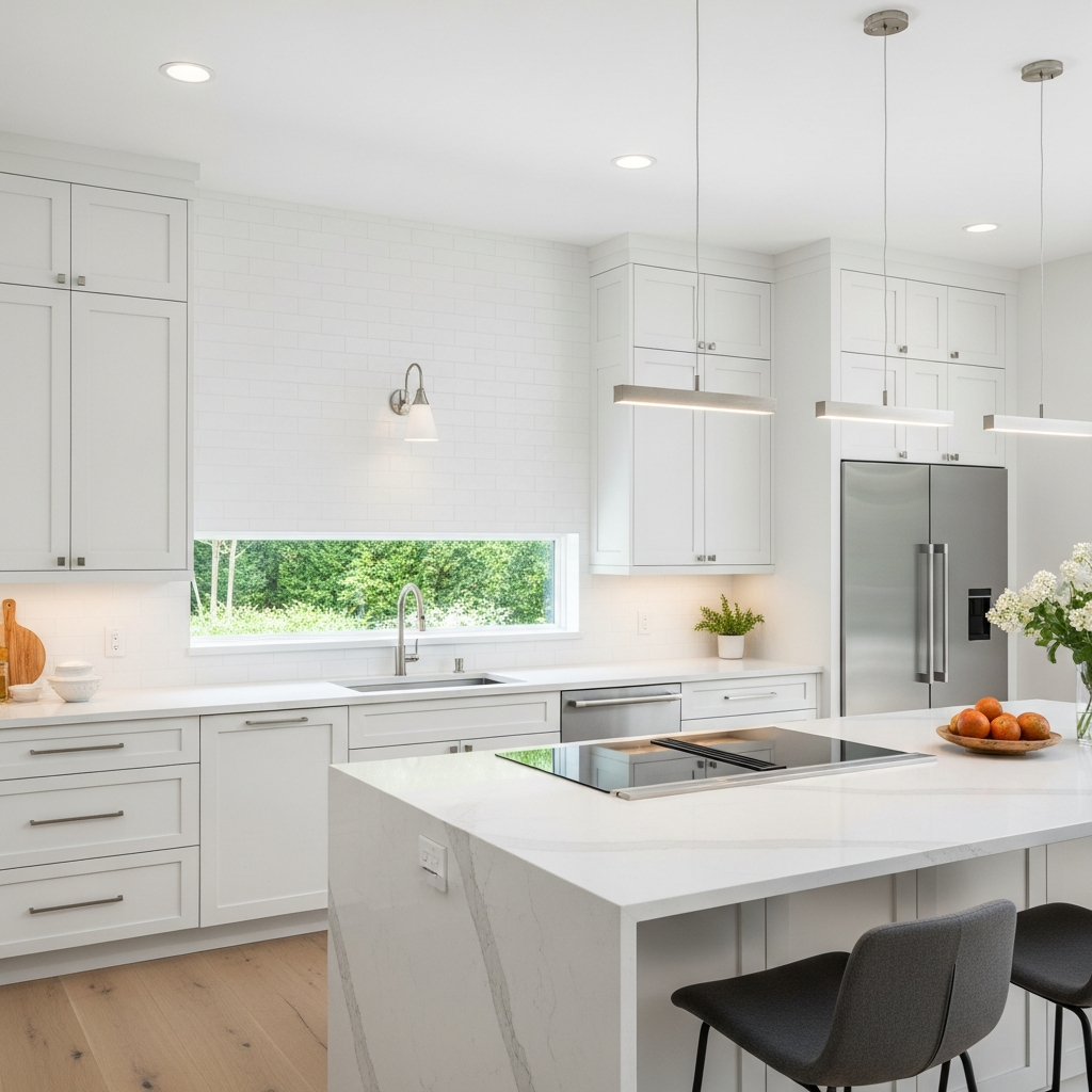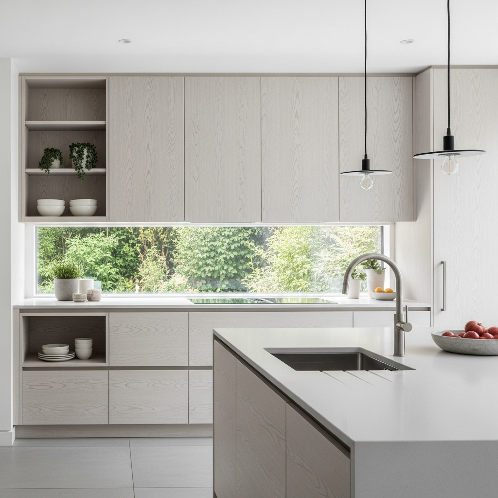 Use white oak cabinets for Scandinavian-inspired kitchen. The pale wood creates bright contemporary cooking space. Your white kitchen modernizes beautifully!