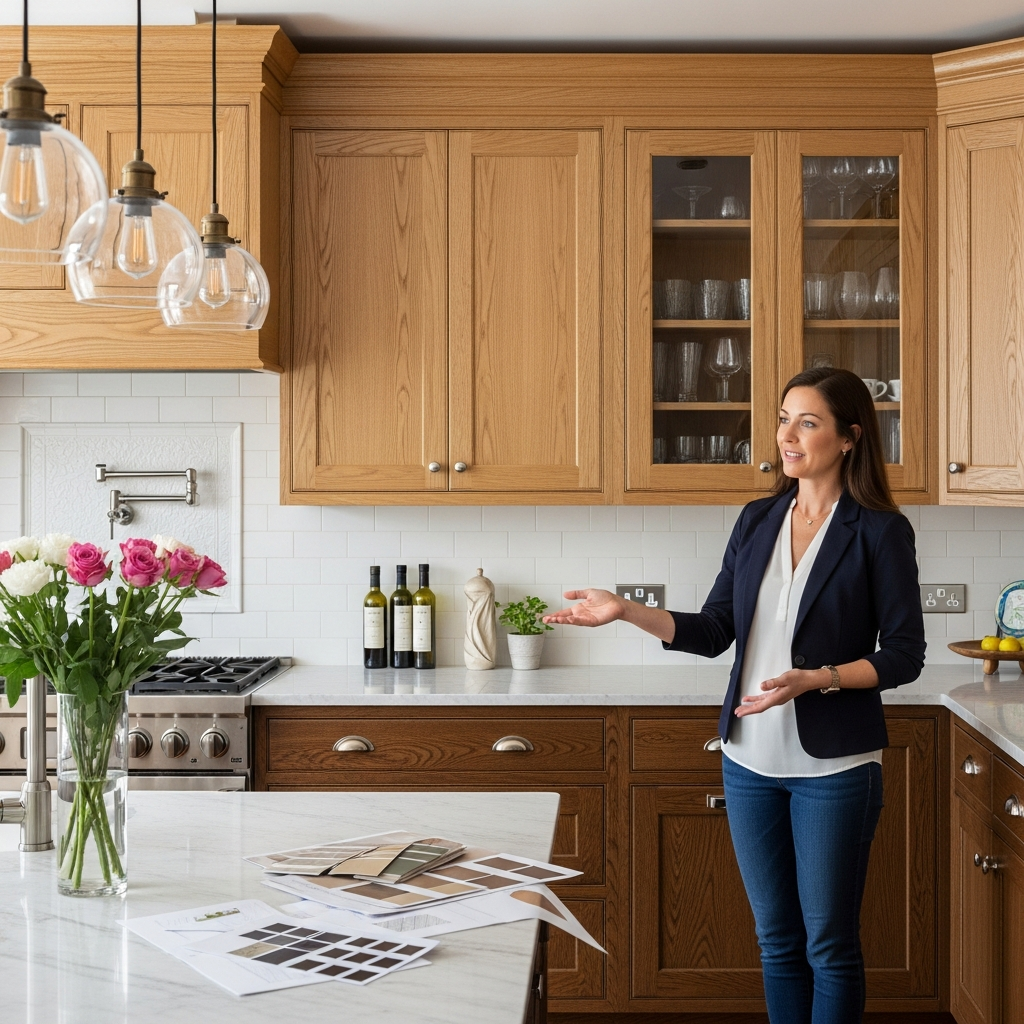 Choose quarter-sawn oak showing distinctive ray fleck patterns. The unique grain adds expensive custom appearance. Your quarter kitchen displays beautifully!