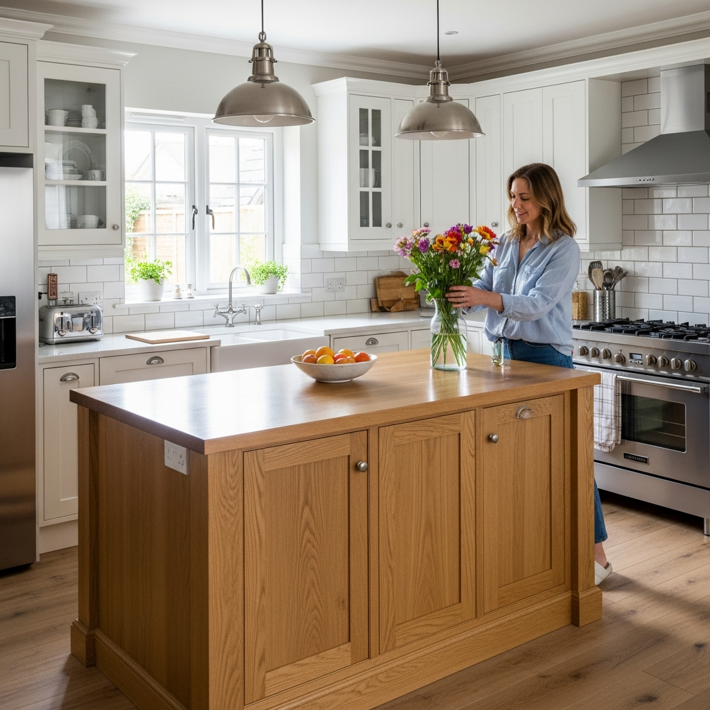 Build island with natural oak while keeping walls white. The standout piece creates visual anchor beautifully. Your island kitchen focuses gorgeously!