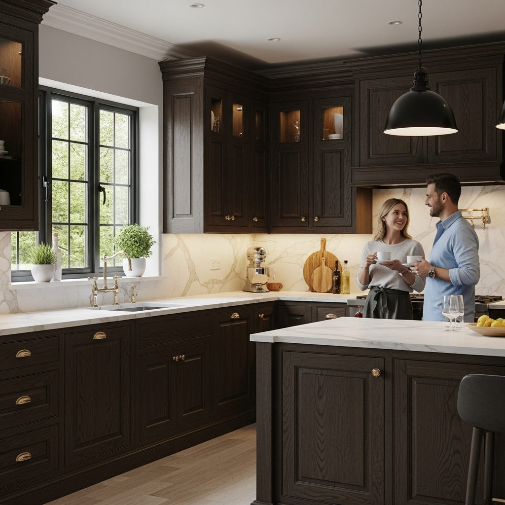 Stain oak cabinets deep brown creating moody kitchen. The rich finish adds sophisticated dramatic feeling. Your dark kitchen grounds perfectly!