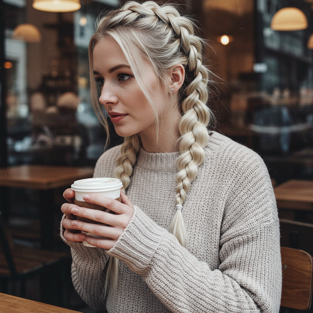 The icy blonde shade think “Scandi” platinum or honey oat gets noticed on Instagram. If flyaways bug you, smooth with Olaplex No.7 Bonding Oil. These braids are easy and stay in place for hours add star or snowflake charms for a cute holiday twist.