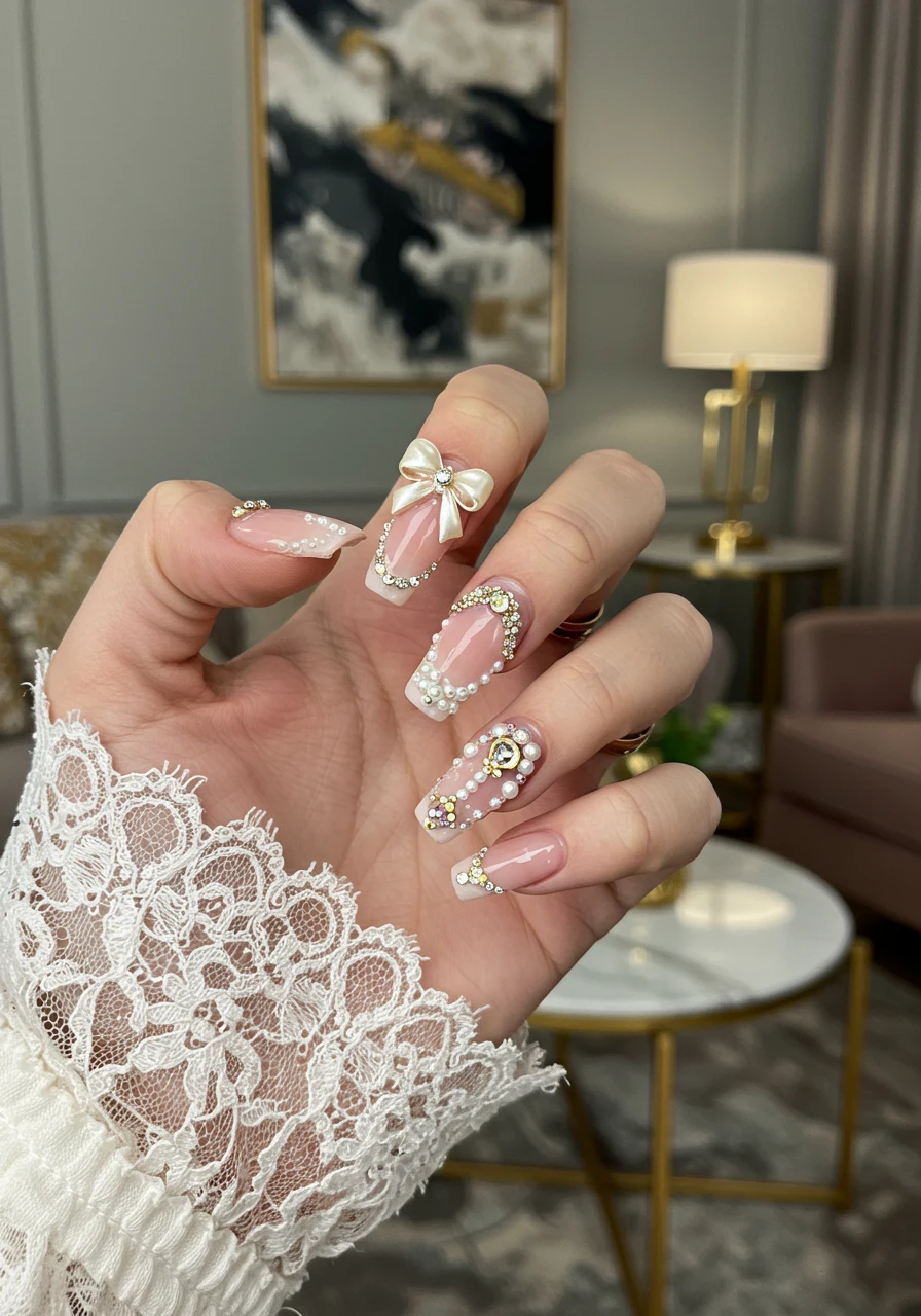 3D nail art takes ballerina nail designs to the next level. Sculpted bows, ribbons, miniature flowers, pearls, or crystals add texture and dimension, creating nails that are mini sculptures.