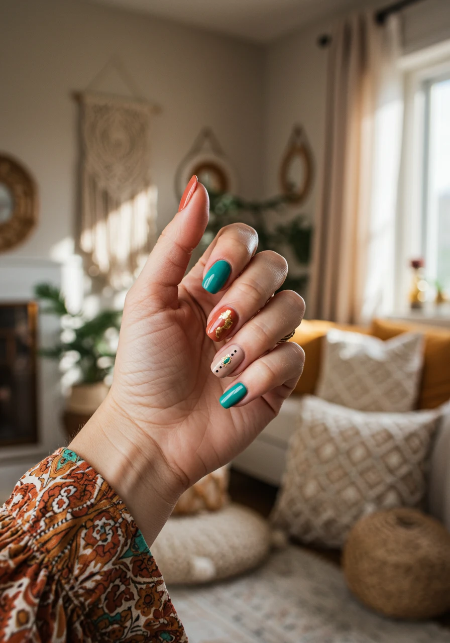 Boho ballerina nails combine earthy tones like terracotta, turquoise, and beige with gold foil, abstract dots, and geometric lines. Inspired by festival fashion and free-spirited art, these nails are eclectic yet elegant.
